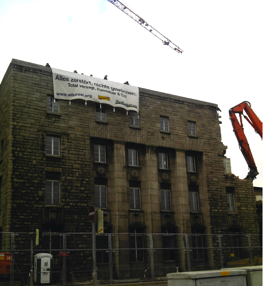 Stuttgart, 12. März 2012: Seit Montag Mittag besetzen zehn Parkschützerinnen und Parkschützer das Dach des Südflügels. Bei dieser unbefristeten Aktion hängen sie ein 9x3 Meter großer Banner an die Fassade des teilweise abgerissenen Gebäudes, es trägt die Aufschrift: „Alles zerstört, nichts gewonnen: Total versagt, Ramsauer & Co!“ Damit weisen die Parkschützer darauf hin, dass die Bahn in der Stuttgarter Innenstadt enormen Schaden anrichtet, ohne einen Gegenwert zu schaffen: Die Bahn reißt wertvolle historische Gebäude ab, zerstört den Schlossgarten, die Seele der Stadt, und ist nicht in der Lage, etwas neues zu bauen. Sämtliche Versprechen, der geplante Tunnelbahnhof werde die Leistungsfähigkeit des Bahnknotens Stuttgart steigern, haben sich als haltlos erwiesen. Inzwischen ist klar: Stuttgart 21 bedeutet einen Rückbau der Stuttgarter Bahninfrastruktur! Wenn Peter Ramsauer eine solche Beschädigung unserer Bahninfrastruktur deckt, versagt er als verantwortlicher Bundesverkehrsminister!